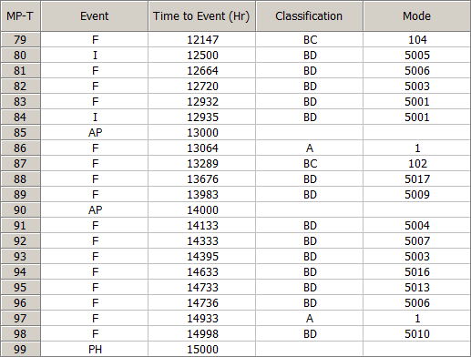 As you can see, in addition to recording the time and mode classification for each failure event (F)—where A = no fix, BC = immediate fix before testing resumes and BD = delayed fix—this data type also allows the team to identify: