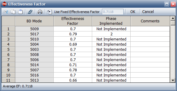 For the BD (delayed fix) failure modes that do not have a specific fix time (I event) recorded in the data set, the Effectiveness Factors window allows the team to specify when the fix was (or will be) implemented. To open the window, choose Growth Data > Crow Extended > Effectiveness Factors.