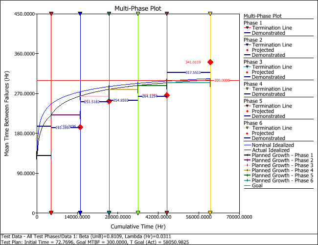 Finally, if you open the "All Test Phases" multi-phase plot, you can see that the demonstrated MTBF eventually exceeded the goal, indicating a successful reliability growth plan.