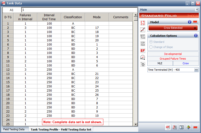 The "Tank Data" standard folio contains the failure times observed during the test. The first data sheet (called "Original Data") contains the exact failure times. To create the second sheet (called "Grouped Data"), the analyst simply opened the original data sheet and clicked the Mission Profile Analysis icon on the control panel.