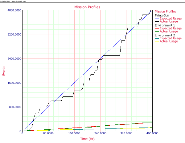 The mission profile folio called "Tank Testing Profile" shows the actual and expected usage for all three tasks. As shown next, the plot shows all three planned mission profiles together with the actual usage during the test. For example, the straight blue line shows the planned usage for the gun firing task and the jagged black line shows the actual usage during the test. You can see that the actual usage tends to fluctuate around the plan (due to normal variations under actual test conditions), but always meet the target at each of the four convergence points. The same applies for the actual usage on the environment 1 and environment 2 tasks.