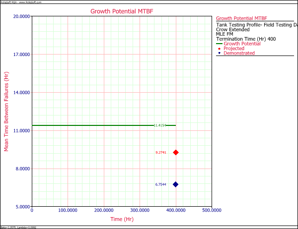 The following plot shows some useful planning metrics obtained from the grouped data analysis with the Crow Extended model: the demonstrated, projected and growth potential MTBFs.