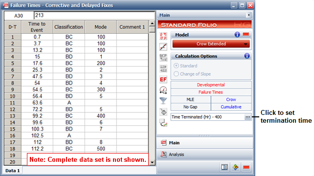 The data from the test are recorded in a Failure Times data sheet configured for cumulative failure times and with the Crow Extended model selected, as shown next. Modes classified as "A" are not addressed. "BC" modes are addressed during the test, and "BD" modes are addressed after the test. Numerical codes were used to identify the modes in the order in which they appeared (e.g., 100 and 200 are the first and second BC modes, 1 and 2 are the first and second BD modes, etc.). To specify that the test is time terminated at 400 hours, click the (...) button on the control panel to open the Termination Time window.