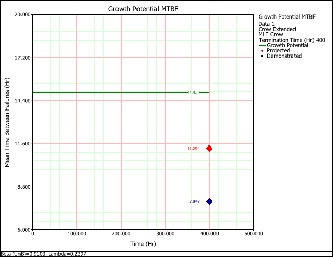 The green Growth Potential line shows that the maximum achievable MTBF given the current management strategy is 14.9957 hours.