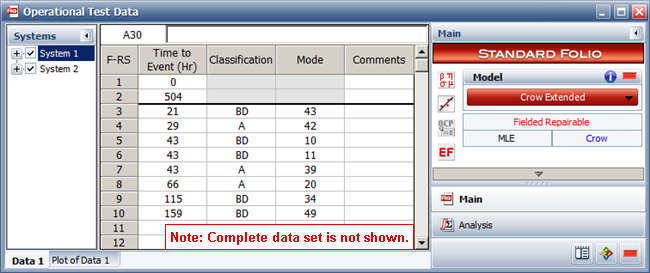 The data from the test are recorded in a Repairable data sheet with the Crow Extended model selected. Modes classified as "A" are not addressed, and "BD" modes are addressed after the test. Numerical codes were used to identify each specific failure mode. Some of the data for System 1 (selected in the Systems panel on the left) are shown next.