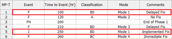 The increased flexibility for the treatment of BD failure modes means that the data set can also contain the exact times when the delayed fixes are implemented. Use the I – Implemented Fix event code to indicate the time of a delayed fix. The I event must have the exact same classification and mode as the prior failure event (F, P or Q). For example, the following picture shows a highly simplified data set where Mode 1 occurs at 100 hours but the fix is delayed. The first test phase ends at 200 hours and then the fix for Mode 1 is implemented during the second phase, at 250 hours of total test time.