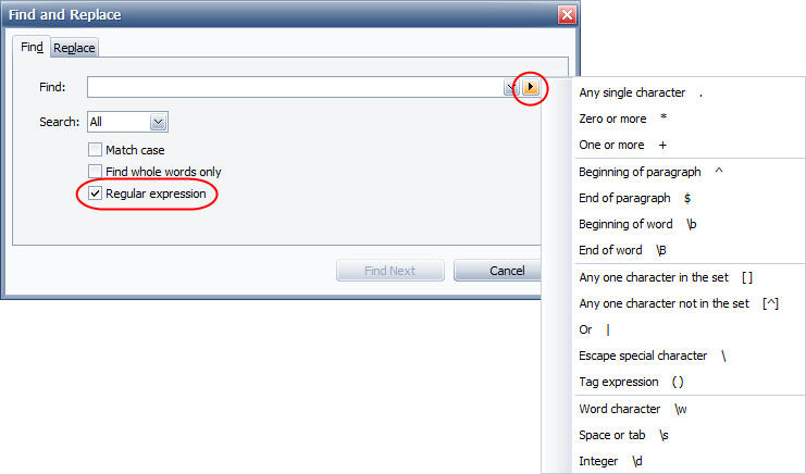 Select Match case if you want to find only the text in the current Word report template with the same case. For example, the search term "teXt" will not find "Text" because the case does not match.