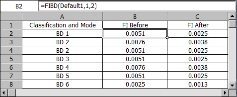 The following table is for a particular data set analyzed with the Crow Extended model. For example, it shows that for BD1, the FI before the fixes is 0.0051 and the FI after the fixes is 0.0025.