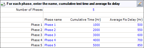 As an example, the following picture shows the inputs for a multi-phase test with 5 test phases that last 1,000 hours each. In the first phase, the planners estimate that delayed fixes (for BD failure modes) will, on average, take 500 hours each. The fix time is expected to increase in later phases.