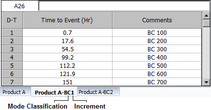For example, if you select to extract BC modes, the failure times for all BC modes will appear in a new data sheet. (If a particular failure mode (e.g., BC 100) has more than one failure time, only the first time will be extracted.) The new data sheet will have the same name as the source data sheet plus the name of the mode classification and an increment to reflect the number of data sheets that have been created for the same classification.