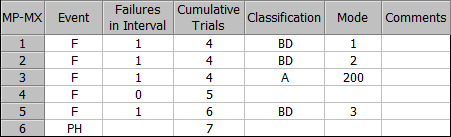 The following example shows the number of trials and failures in each test interval. The Event column specifies the type of event the data point represents. See Event Codes for Multi-Phase Data for information on all seven possible event types. In the following data sheet, F = failure time and PH = end of phase. The Classification and Mode columns are for identifying and classifying the failure mode that is responsible for the failure (for F, P or Q events) or the mode that received a fix (for I events).