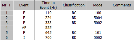 The following example shows the failure times of a single system, entered cumulatively. The Event column specifies the type of event the data point represents. See Event Codes for Multi-Phase Data for information on all seven possible event types. In the following data sheet, F = failure time, AP = analysis point (i.e., a designated time at which calculations will be performed and results obtained), and I = the time when the fix for a particular failure mode was implemented. The Classification and Mode columns are for identifying and classifying the failure mode that is responsible for the failure (for F, P or Q events) or the mode that received a fix (for I events).