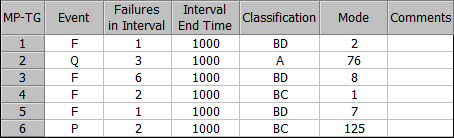 The following example shows the total test time at the end of each interval and the number of failures that occurred in each interval. The Event column specifies the type of event the data point represents. See Event Codes for Multi-Phase Data for information on all seven possible event types. In the following data sheet, F = failure time, Q = quality-related issue and P = performance-related issue. The Classification and Mode columns are for identifying and classifying the failure mode that is responsible for the failure (for F, P or Q events) or the mode that received a fix (for I events).