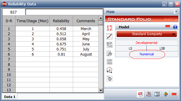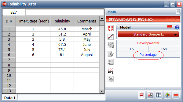 The Reliability data type is used for modeling the relationship between time and reliability. You can use the Standard Gompertz, Modified Gompertz, Lloyd-Lipow or Logistic models to track how the reliability changes over time.