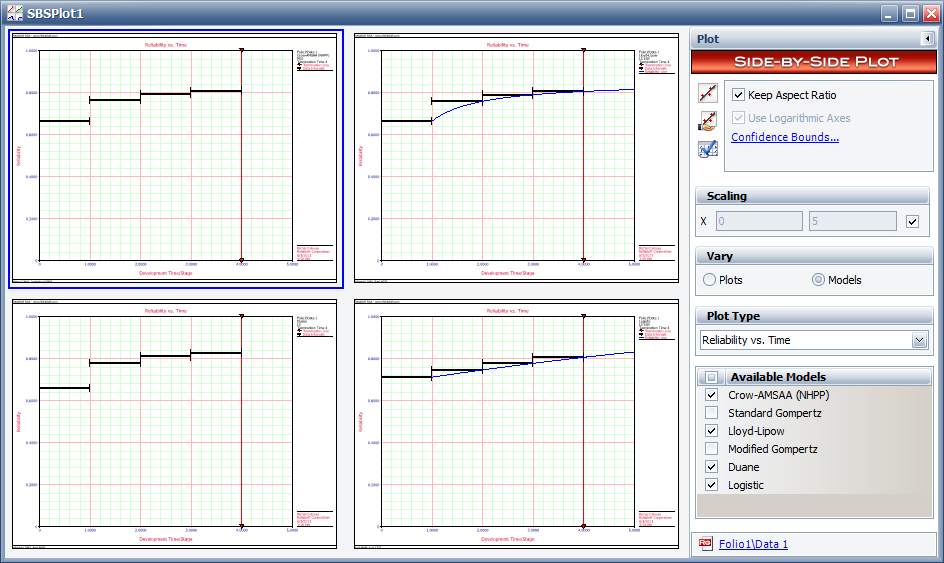 You can choose to vary either plot types or models. To view a single plot in greater detail, double-click the plot. Double-click the plot again to return the window to the side-by-side view.