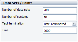 In the Data Sets / Points area on the Main tab, specify that you will create 200 data sets in order to simulate a time terminated test that ends at 2,000 hours. As a conservative guess, enter 10 for the Number of systems that will be tested. The area will appear as shown next.