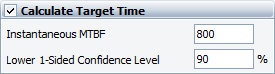 On the Test Design tab, select the Calculate Target Time option, then specify that you will estimate the test time required to demonstrate an instantaneous MTBF of 800 hours. To place a target point on the instantaneous MTBF vs. time plot that marks the 90% lower one-sided confidence bound on the required test time, enter 90 in the Lower 1-sided Confidence Level field.