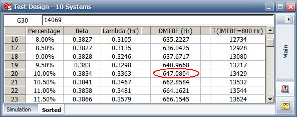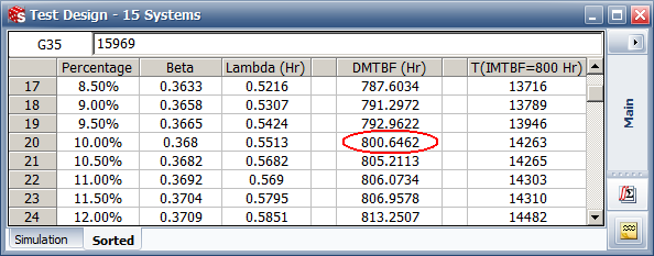The Sorted sheet shows the results for each column sorted from least to greatest. On this sheet, you can see the demonstrated MTBF at the 10th percentile of the results (i.e., 90% one-sided lower bound), shown next.
