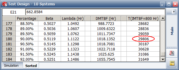 On the Sorted sheet, you can see that the 90% upper one-sided confidence bound on the required test time is 29,806 hours, as shown next.