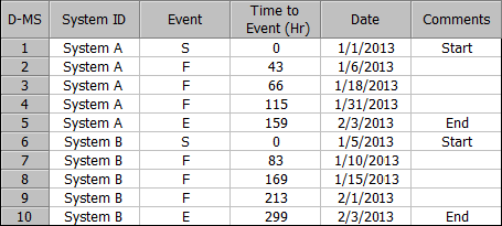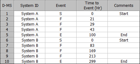 With this data type, you can enter the data in the Normal View or Advanced Systems View. The following example shows the Normal View. The System ID column is for recording the ID of the system that the data point relates to. The Event column specifies whether the row represents the start time (S), failure time (F) or end time (E) of the system. The Time to Event column is for recording the total cumulative test time when the specified event occurred.