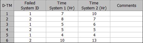 The following data sheet shows an example in which the times are cumulative. The first failure occurred for System 1 (indicated by a 1 in the first column for row 1). At that point, the operating times for both systems were recorded — 7 hours for System 1 and 10 hours for System 2 — and the same fix was applied on both systems. The next failure occurred for System 2 (indicated by a 2 in the first column for row 2). Once again, the operating times for both systems were recorded — 15 hours for System 1 (8 since the last event) and 17 hours for System 2 (7 since the last event). The rest of the data can be interpreted in a similar manner.