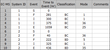 With this data type, you can enter the data in the Normal View or Advanced Systems View. The following example shows the Normal View. The Classification and Mode columns are for identifying and classifying the failure mode responsible for each failure. The Event column specifies the type of event the data point represents. See Event Codes for Crow Extended for information on all five possible event types. In the following data sheet, S = start time, F = failure time, I = the time when the fix for a particular failure mode was implemented and E = end time.