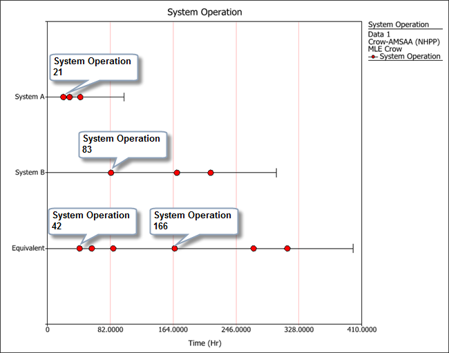 The following plot shows the failure times of both systems in the example, along with the timeline for their equivalent system. When the first failure occurred at 21 hours (System A), the total operating time for the test (represented by the equivalent system) is 42 hours because there are two systems running concurrently. In other words, the analysis multiplies the failure time of the failed system by the total number of systems in the test to obtain the equivalent operating time. Similarly, the first failure of System B (at 83 hours) is shown in the equivalent system as occurring at 166 hours.