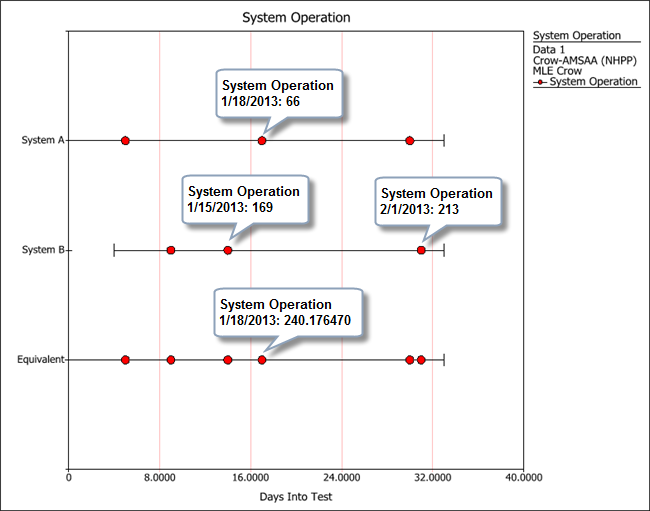 The following plot shows the failure times of both systems in the example, along with the timeline for their equivalent system. For example, the plot shows that when System A failed on 1/18/2013, it had accumulated 66 hours of operating time, but we don’t know the exact operating time for System B at that point.
