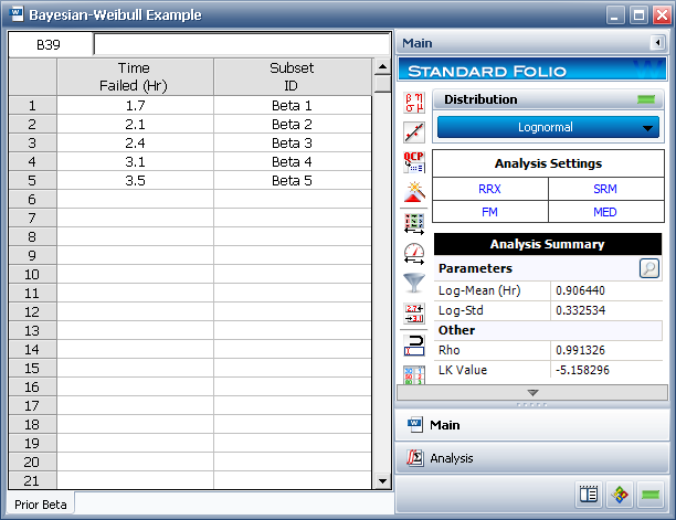 The prior information in the analysis is in the form of a distribution fitted to a range of likely beta values. In the context of life data analysis, the beta parameter is used to define the shape of the Weibull distribution, which reflects the failure behavior of a product (i.e., whether the failure rate increases, decreases or remains constant over time). The range of beta values could be obtained from data for a similar product design or from engineering knowledge. When a distribution is fitted to the range of beta values, the distribution is called the prior distribution of beta and it serves to model the most likely failure behavior of the product.
