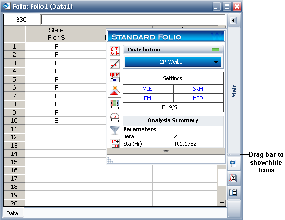 The control panel can be toggled between hidden and displayed states by clicking the Hide or Show icon in its title bar, as shown below using a Weibull++ standard folio as an example.