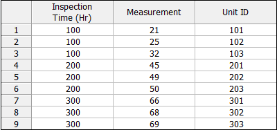 The Inspection Time column indicates the time at which the degradation of the unit was measured. Time may also be measured as the amount of usage the sample accumulates or as the factor that degrades the unit.