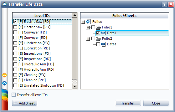 The following example shows the Transfer Life Data window for a system with three 1st level components. The [F] indicates an analysis of the failures, while [E] indicates an analysis of the general events (note that a combined analysis of F and E events would display [C]). The [FD] indicates that the data set is for the failure distribution, while [RD] indicates that the data set is for the repair distribution.