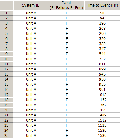 The data set used in this example is available in the example database installed with the Weibull++ software (called "Weibull10_Examples.rsgz10"). To access this database file, choose File > Help, click Open Examples Folder, then browse for the file in the Weibull sub-folder.