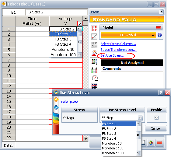 In the ALTA standard folio data sheet, each row represents a tested unit (or group of units). To choose the profile that describes the test conditions for a unit or group, first make sure a cumulative damage life-stress model is selected on the control panel. Then select the cell in the appropriate stress column for the unit or group. A drop-down list will appear in the cell. The list displays all the validated stress profiles in the currently active project.