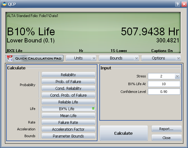 To estimate the B10 life of the device, choose ALTA > Analysis > Quick Calculation Pad or click the icon on the control panel.