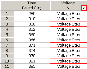 After creating the stress profile, return to your ALTA standard folio. Select CD-Weibull (i.e., the cumulative damage life-stress relationship combined with the Weibull life distribution) from the Model drop-down list. Click Stress Transformation and apply the Logarithmic transformation to the stress. Then, in the data sheet of the folio, enter the failure times. To assign the stress profile to a failure time, click the corresponding cell in the Voltage column of the data sheet. Click the arrow in the cell and choose Voltage Step from the drop-down list. After you have filled out the data sheet, it should appear as shown next.