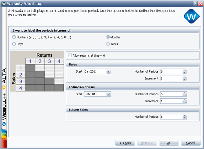 If the periods are labeled in terms of days, months or years, you can change the time units and periods anytime by choosing Warranty > Tools > Data Sheet Setup or by clicking the icon on the control panel.