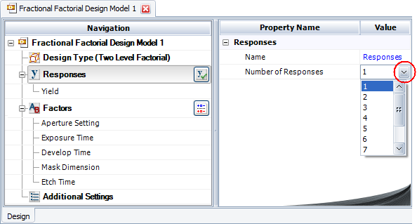 Before building your design, make sure you have the correct number of responses (i.e., the types of output that you want to measure) and that each response is defined appropriately. These settings are selected on the Design tab.