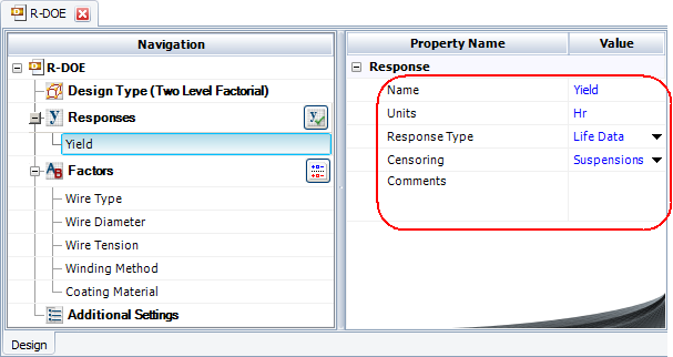 Response Type specifies whether you will be using life data (e.g., failure times) for the response values. If you select Life Data from the drop-down list, the data sheet will be configured for reliability DOE. Note that only one response in a given design can contain life data.