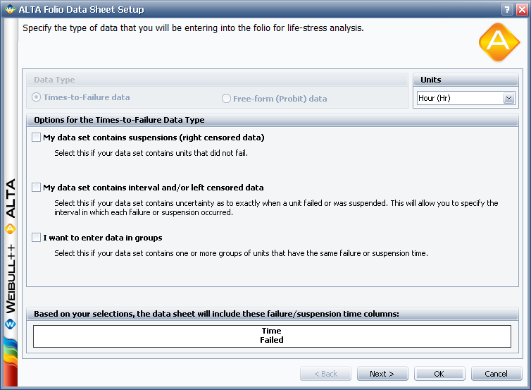 The ALTA life-stress data folio contains the tools for performing an accelerated life testing data analysis. A setup window for configuring your folio will be displayed when you: