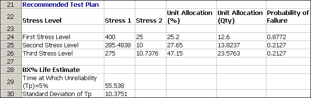 The Test Plan Results sheet displays a summary of your inputs, the utility's recommended test plan and the time at which unreliability equals the value you entered in the BX% Life Estimate Sought field (i.e., Tp). If you entered a number of available test units, it also displays the standard deviation of Tp.