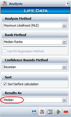 By default, Weibull++ calculates the point estimates from the median value of the posterior distribution. This is because the median value always corresponds to the 50th percentile of a distribution. You have the option to change this setting and calculate the mean value of the posterior distribution instead; however, note that the mean is not a fixed percentile and this could cause issues when comparing results across different data sets. The option to change this setting is available on the Analysis page of the control panel when you choose the Bayesian-Weibull analysis, as shown next.