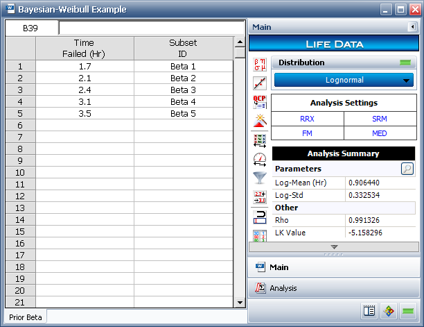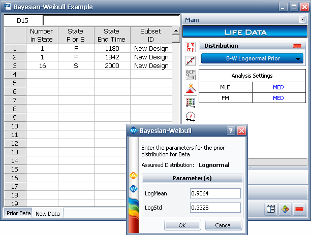 Next, collect the current times-to-failure data of the new design and enter the information in a new data sheet, as shown next. On the Main page of the control panel, click the Distribution drop-down list and choose Bayesian-Weibull > B-W Lognormal Prior. Click Calculate. A window similar to the one shown in the inset will be displayed.