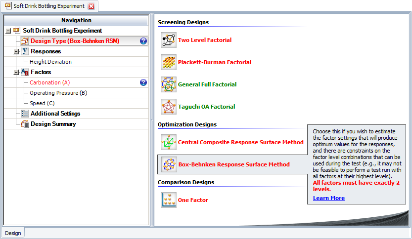 If a design is red, then one of the current factor settings is incompatible with it. When you select a red design type, the factor(s) it is incompatible with will become red as well. To find out why the setting is incompatible, read the design type's description. For example, the red text in the design description below says, "All factors must have exactly 2 levels," which indicates that the Carbonation factor (also shown in red) does not have the required number of levels for a Box-Behnken design.
