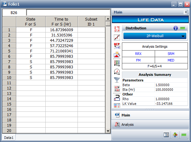 In this case, the 1st failure time (T1) is estimated to be about 16.874 hours. This means that when you conduct a test on a product using the same sample size and reliability model, there is a 50% chance that the 1st failure will occur after 16.874 hours. Therefore, 16.874 can also be thought of as the one-sided lower bounds for the 1st failure time at a confidence level of 50%. The rest of the failure times in the data set can be read in a similar manner.