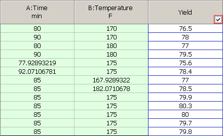 Each column contains a check box in the column heading that specifies whether the response will be included in the analysis. If a column is selected, the color of the check box border will indicate the status of that response's analysis. A green border indicates that the response has been analyzed using the current analysis settings; a red border indicates that it has not. Note that if you clear the check box, you will not be able to specify analysis settings for the response, nor will you be able to display it in plots or use it in optimization.