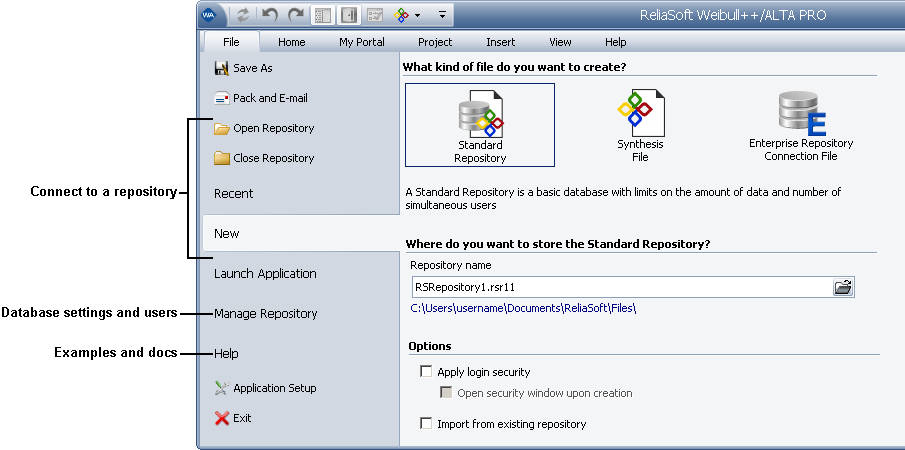 Use commands on the File menu (New, Recent or Open Repository) to create or open a Synthesis repository (database). (See Database Types.)