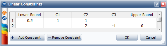 Each row in the Linear Constraints window represents an equation that defines a single constraint. The first and last columns represent lower/upper bounds of the constraint, and the middle columns represent the coefficients of each component in the blend (the column headers show the abbreviated factor names). If a constraint lacks a lower or upper bound, or if there certain components that are not considered, you can leave those cells blank.