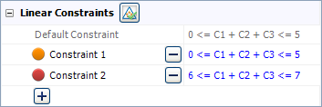 Colored dots will appear next to any problematic constraints. Red dots represent incompatible constraints, and orange dots represent unnecessary ones. For example, Constraint 1 below is unnecessary because it is identical to the default constraint. And Constraint 2 is incompatible with Constraint 1 because no blend can have an amount that is both at most 5 (Constraint 1) and at least 6 (Constraint 2).
