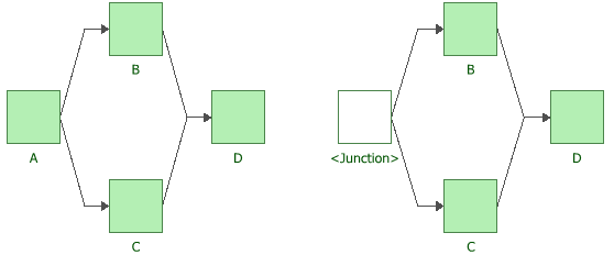 In a basic parallel configuration, items are considered to be redundant. In the RBDs shown next, the system will continue to function if either Block B or Block C fails. (The second RBD shows an example of a junction block used as a starting block.)